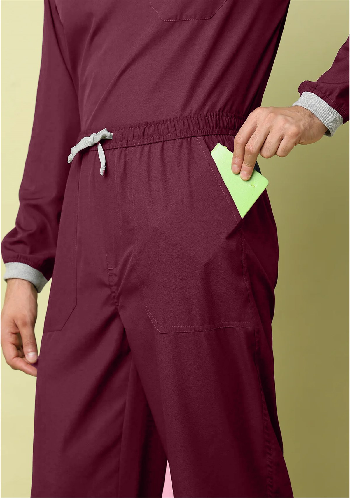 Medilap Scrubs medical scrubs cater to all your storage needs. Our scrubs for men include 3 spacious front pockets on the shirt and 4 functional pockets on the pants (2 on the sides and 2 on the knees) for storing medical gear, large enough to accommodate phones. All items in this set are odor-resistant and feature a grosgrain binding.