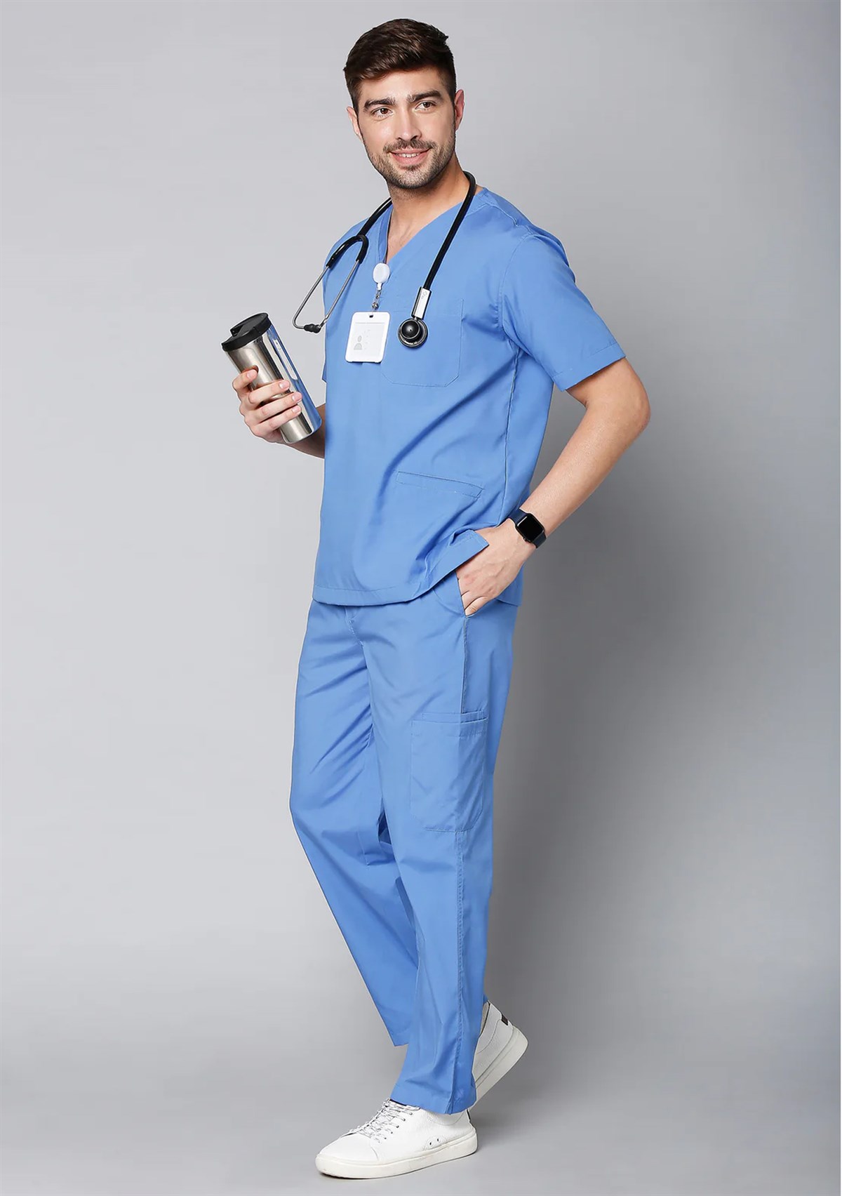 Medilap Scrubs medical scrubs cater to all your storage needs. Our scrubs for men include 3 spacious front pockets on the shirt and 4 functional pockets on the pants (2 on the sides and 2 on the knees) for storing medical gear, large enough to accommodate phones. All items in this set are odor-resistant and feature a grosgrain binding.