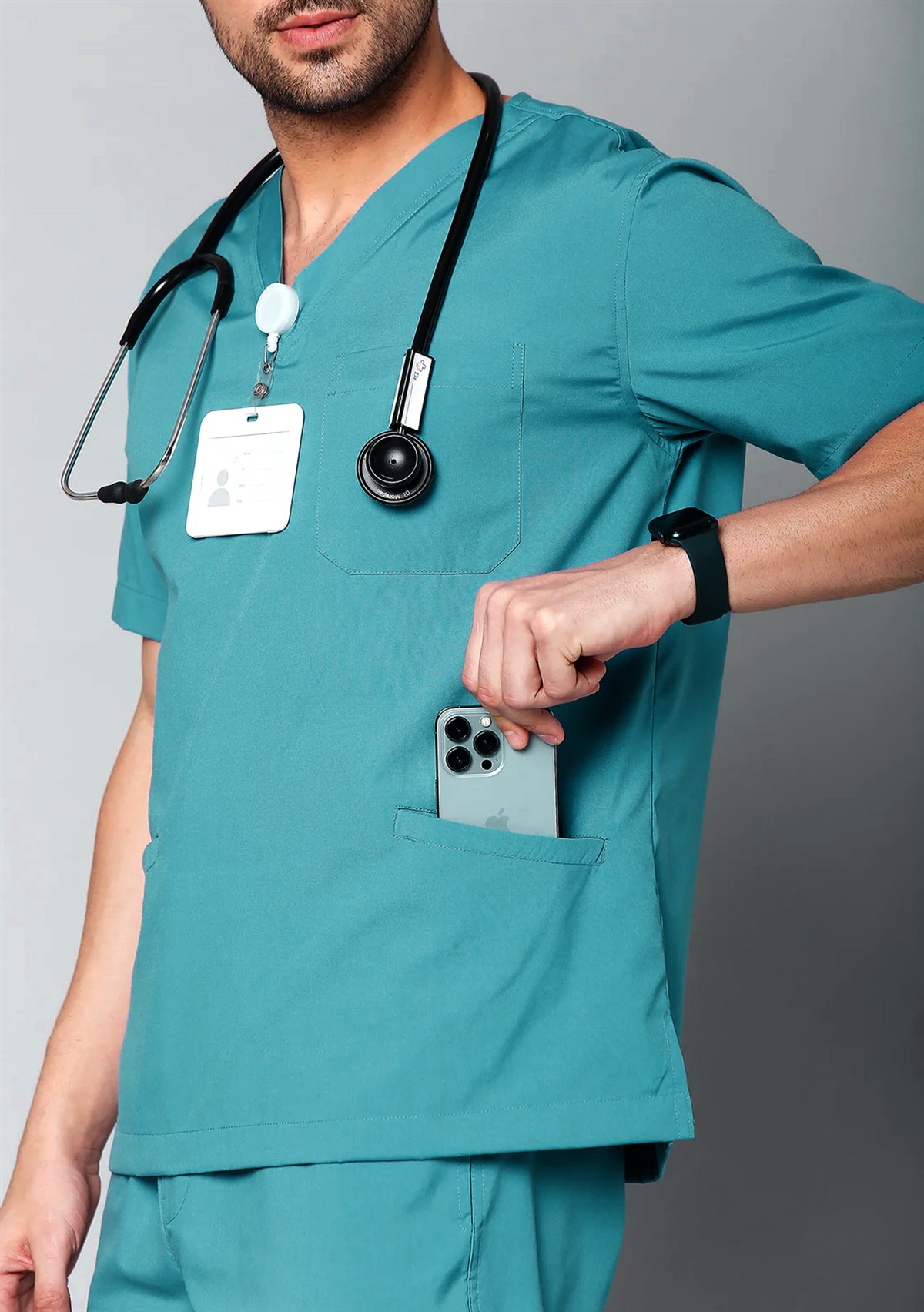 Medilap Scrubs medical scrubs cater to all your storage needs. Our scrubs for men include 3 spacious front pockets on the shirt and 4 functional pockets on the pants (2 on the sides and 2 on the knees) for storing medical gear, large enough to accommodate phones. All items in this set are odor-resistant and feature a grosgrain binding.